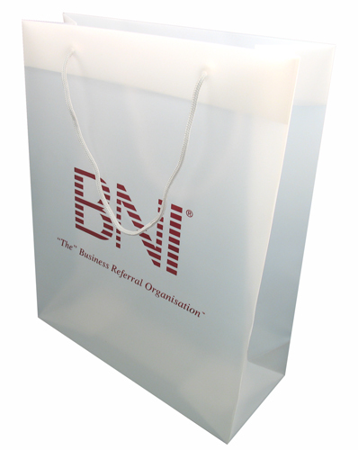 BNI Business Networking International Boutique Style Carrier Bag Polypropylene boutique style carrier bag with white cord handles. Screen printed with the BNI identity to one face. Promotes the BNI networking organisation.