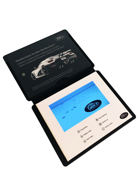 The video plays by simply clicking a button. Pause and volume is also a feature. We can load your video or presentation but you can then change these so the unit can be used time and time again. The tablet sits inside a high quality case which gives it full protection.
